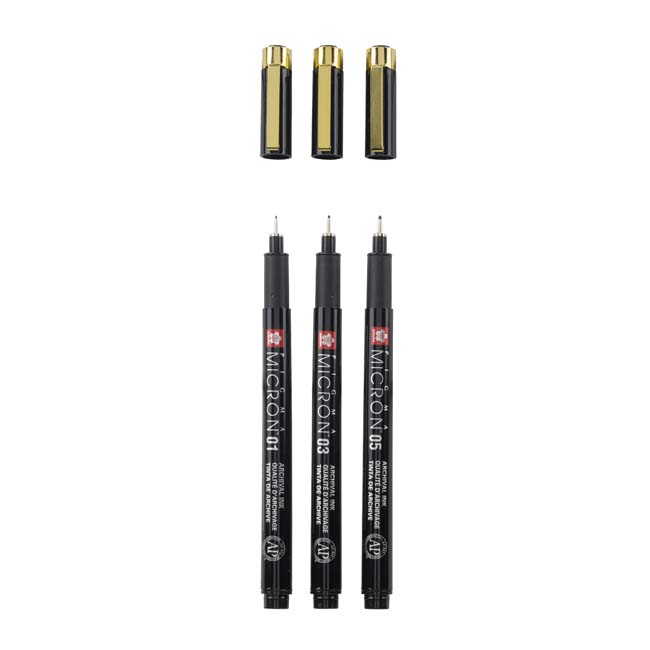 Gold Edition Pigma pens. Διαθέσιμα μεγέθη μύτης: 1 x 01 (0.25 mm), 1 x 03 (0.35 mm), 1 x 05 (0.45 mm)
